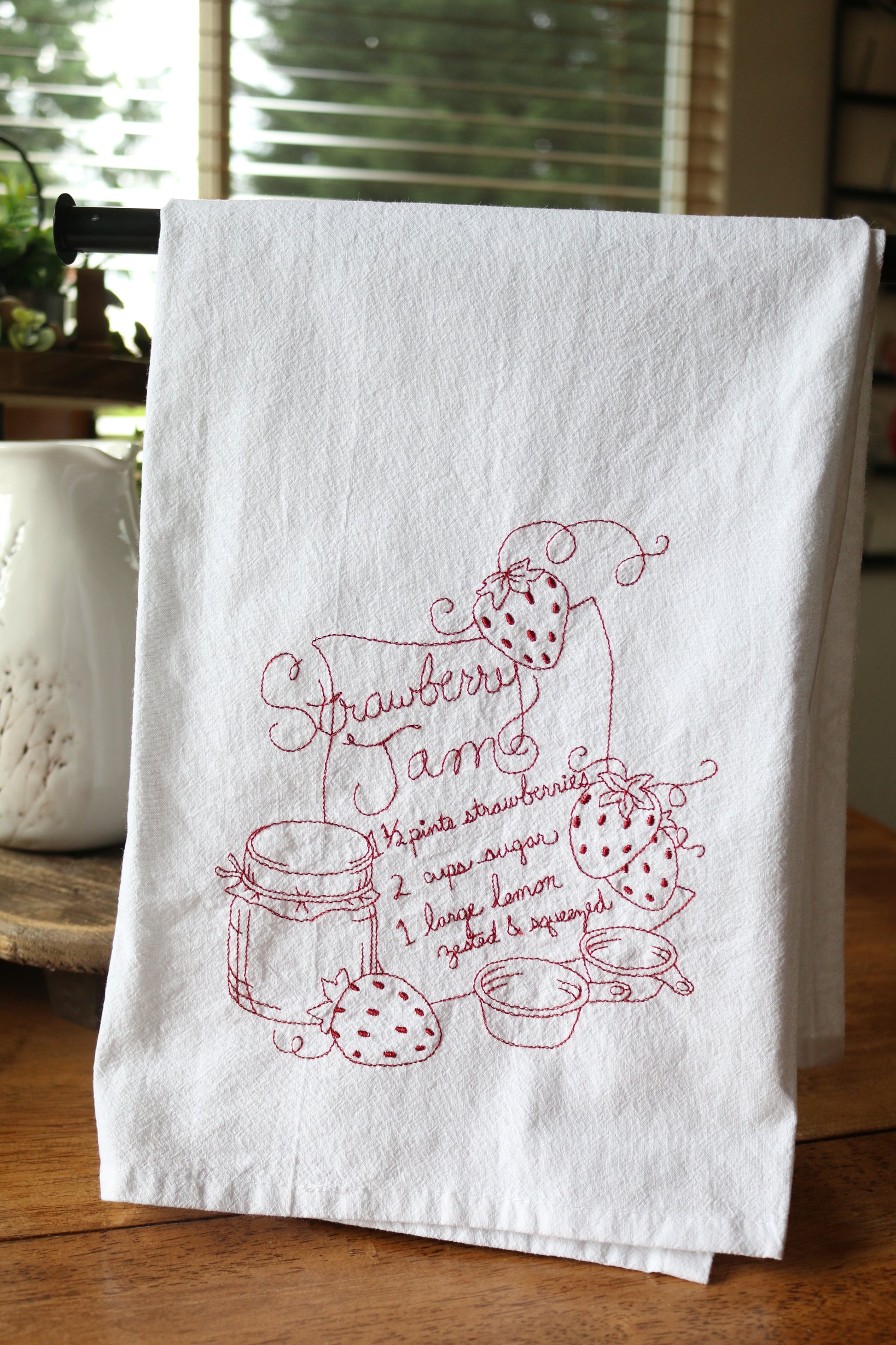 Redwork Embroidered "Strawberry Jam" Floursack Towel